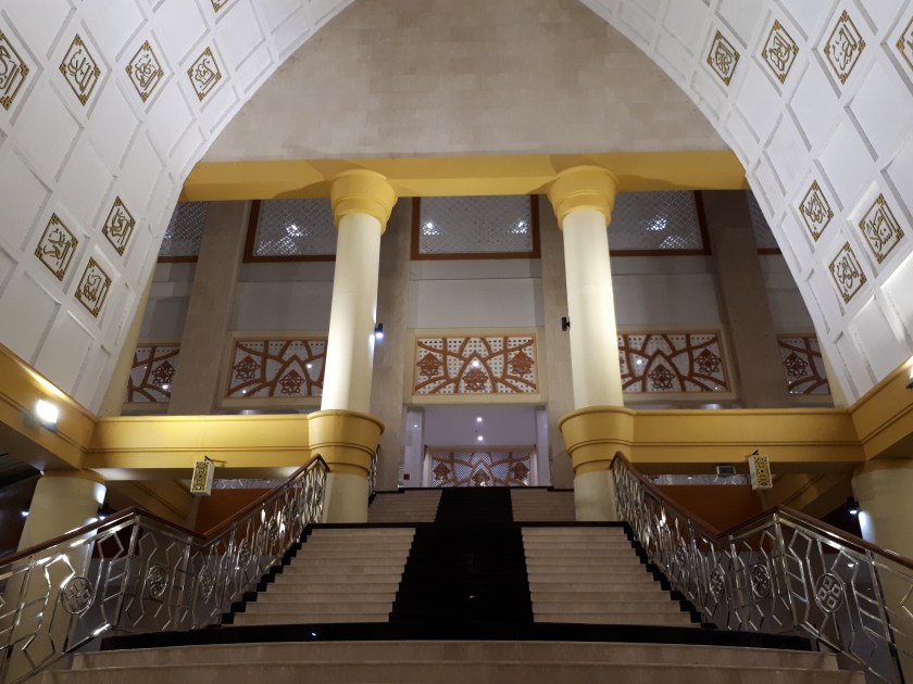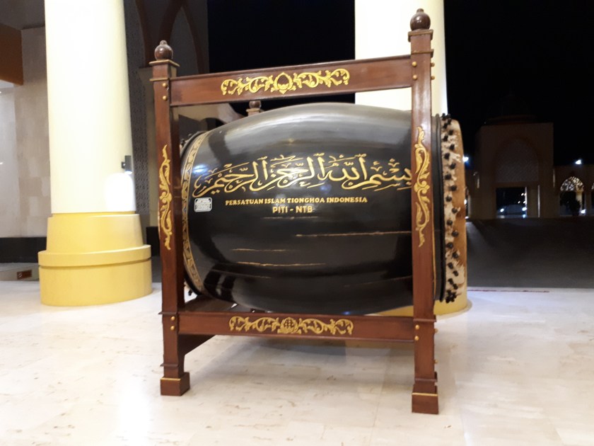Menyambut kami nuansa emas begitu bersinar dan kembali kami takjub karena keindahan bangunan yang dilengkapi 4 buah eskalator karena posisi mesjid harus kembali naik. Pilihan selain eskalator bisa juga meniti tangga yang cukup lumayan. Sebelum naik eskalator,mnenyempatkan diri mengambil gambar bedug besar yang berada di samping kanan.