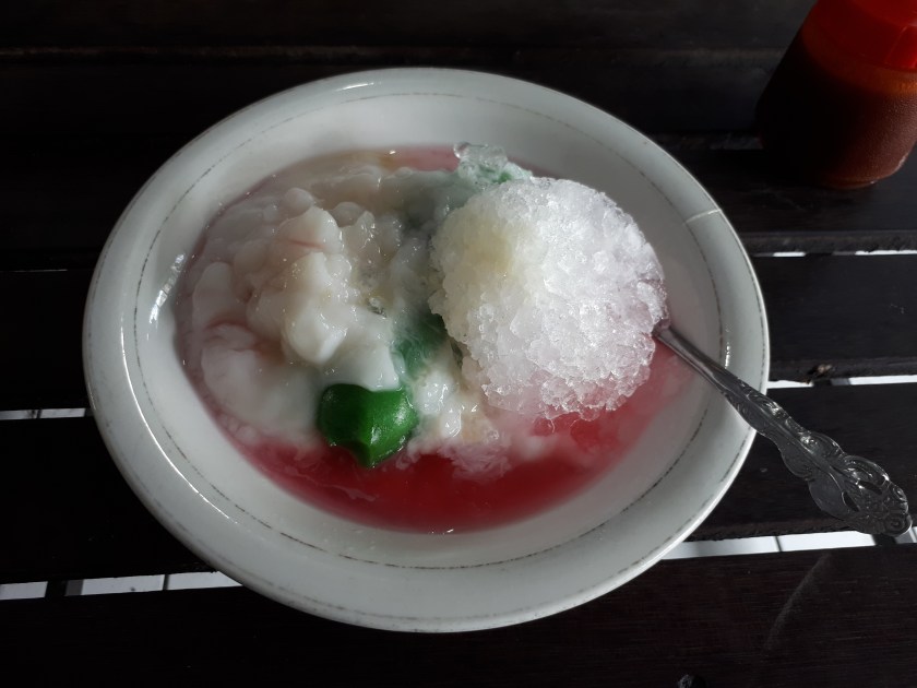 Kelima, Pisang Ijo. Itu sajian cuci mulut yang nikmat. Dengan terpaksa melanggar rumus diet karena penganan ini sarat karbo dan gula. Tapi demi review blog yaa terpaksa dinikmati (hehehe… alasannya klise ya?). Pisang ambon dibungkus lapisan terigu berwarna hijau, disajikan di piring ditemani seperti bubur sumsum berwarna putih plus diguyur kuah merah manis dari sirup plus gerusan es batu. Nikmat pisan, dingin, manis dan manis… ups.