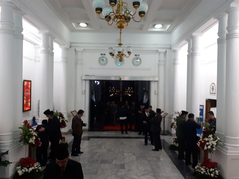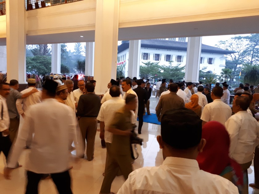 Yang pasti bukan hajat kawinan atau khitanan, tapi semua pegawai pemprov Jabar yang diberi amanah jabatan sedang hadir bersama dalam rangka resiko jeneng alias resiko jabatan untuk mengikuti rangkaian acara HUT Republik Indonesia ke 72 tingkat Provinsi Jawa Barat, dimana malam ini adalah acara ‘Renungan Suci.’