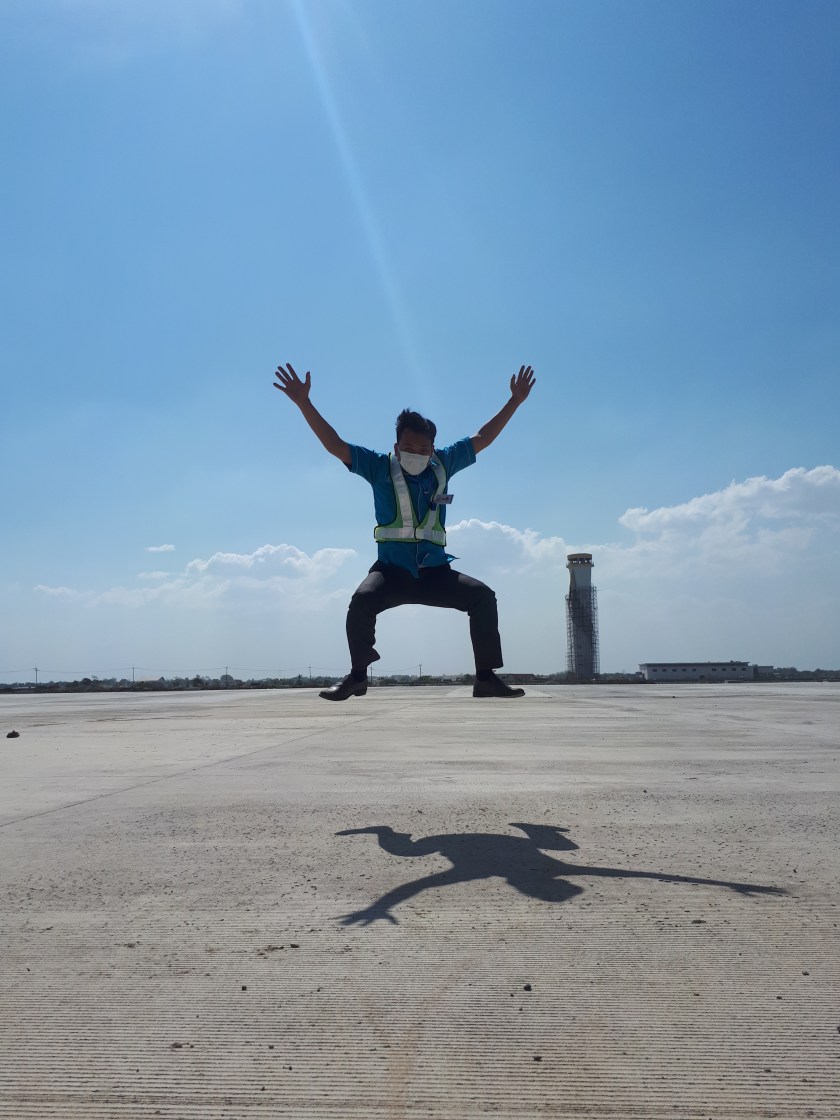 Ternyata di area Apron bandara yang luaaas pisan dan cuaca cukup terik sehingga menghela nafas dikit aja langsung keringetan, apa lagi klo inget kamu (naon seeh ga puguh-puguh). Dengan background menara pengawas yang dibangun oleh Pemerintah Pusat melalui AirNav akhirnya ada juga yang menjajal loncat dan sesaat berpisah dari bumi.
