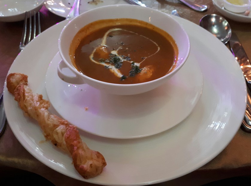 Sajian kedua adalah soup kepiting dan bermacam campurannya atau lengkapnya ‘Crab bisque with seafood dumplings, parmesan puff pastry straw’ tersaji semangkuk soup kecoklatan dengan roti bawang. Nggak banyak basa-basi. Sikat habis bersih tak bersisa. Eh sisa ding… mangkok piring dan sendoknya.
