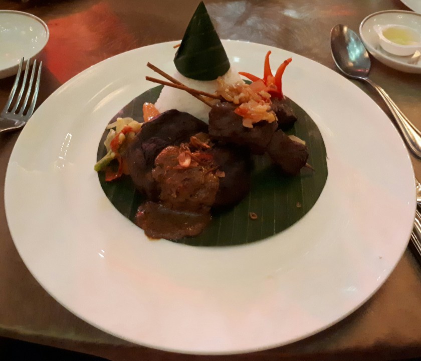 Tibalah menikmati sajian utama (Main course) yang full daging yaitu tenderloin dan sate maranggi ala hotel. Pasti ada nasi dibentuk kerucut jadi tumpeng super mini. Berhubung udah 1 tahun brenti makan nasi ya…. disisa-in dech. Klo tenderloin dan satenya jelas dieksekusi setelah terlebih dahulu dipotong-potong kecil untuk mempermudah penyuapan (ini penyuapan dalam arti sesungguhnya).