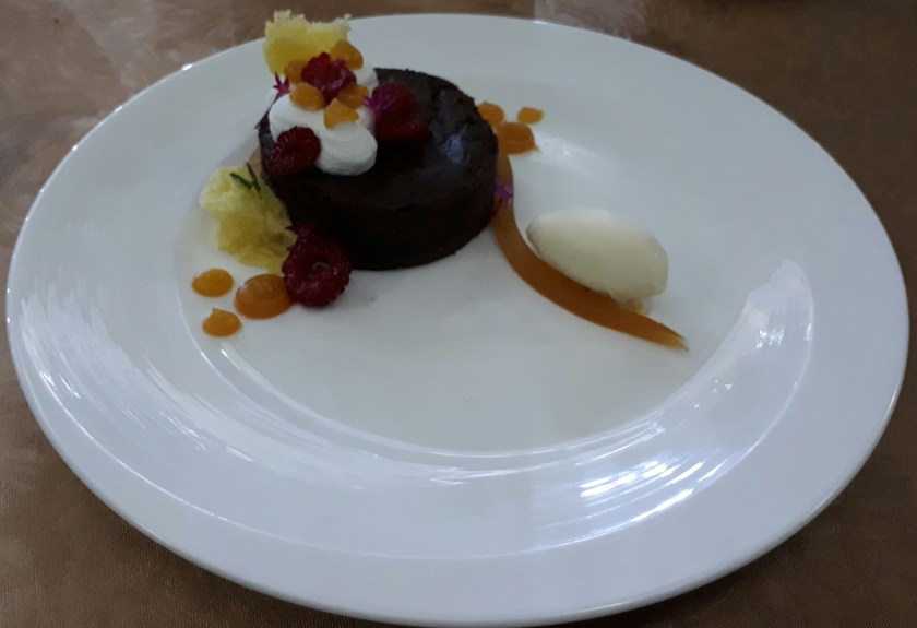 Makanan tersaji untuk menutup sesi table manner ini adalah kue coklat dan mini ice cream atau nama lengkapnya ‘Baked chocolate mouse and apricot cake with almond crumble, fresh raspberries and vanilla bean ice cream’. Hanya berani setotol saja, nyacapkeun kapanasaran. Tak berani dimakan tuntas karena ada protokol makanan yang musti dijaga tegas.