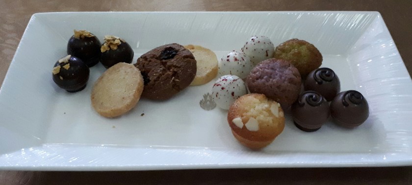 Terakhir tersaji kue-kue dan bola-bola coklat yang terlihat menggoda. Lagi-lagi hanya berani memandang dan mengabadikan saja agar dapat dikenang lebih lama. Plus pilihan hot black coffee atau teh yang menutup resmi jamuan makan malam di acara ini.