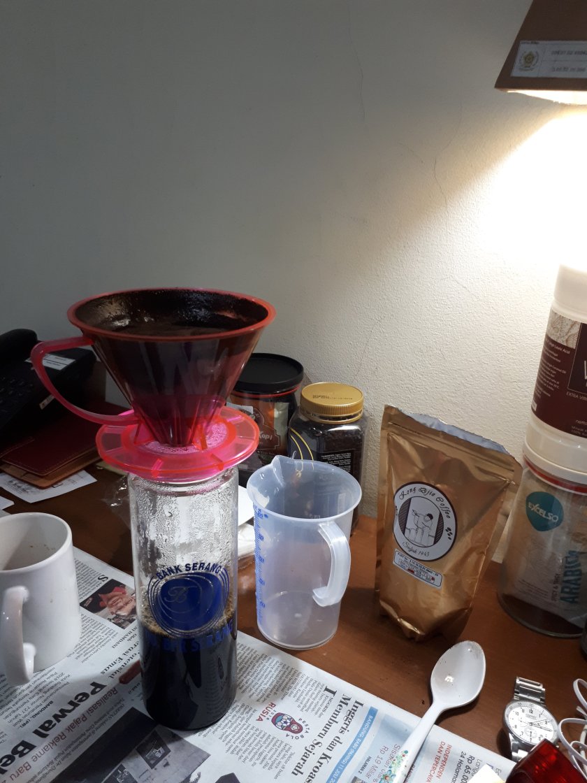 Proses seduhan berlangsung dan musti sabar menunggu air kopinya menetes. Karena bentuk kopinya sudah bubuk halus maka manual brew pame V60 agak lama nembus kerapatan kopi bubuknya. Harum rasa menyambar ujung hidung yang tak sabar menyecap rasa.