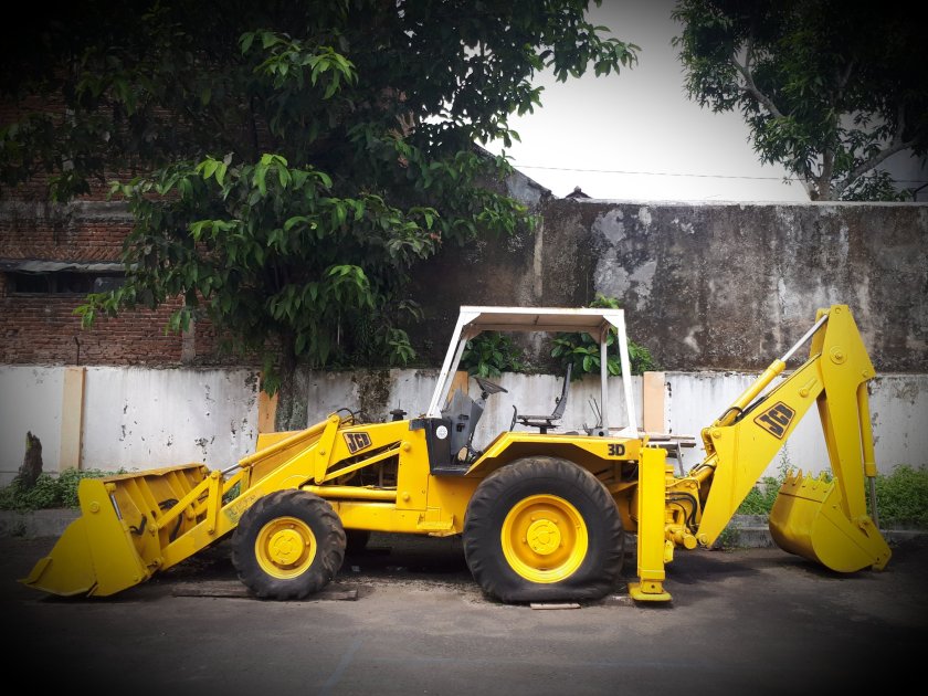 Mung nu matak bingung, mobil dines Mang Darma téh merkna Komatsu Backhoe, jaba banna keur kempés. Mang Darma ngajeten ngaraga meneng. (AKW).