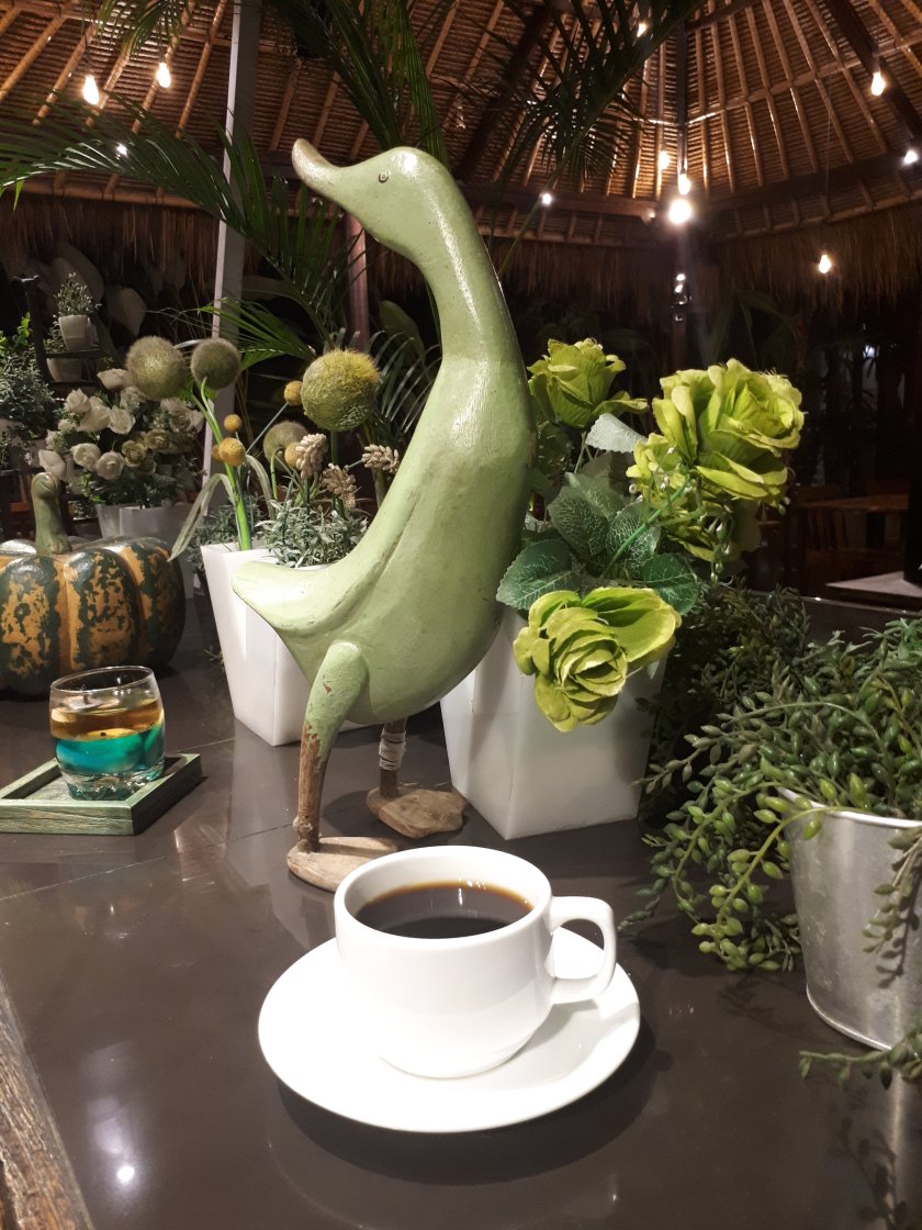 Padahal sebetulnya adalah secangkir kopi hasil racikan sang baristi.. eh barista putri. Kopinya… ya. Itu tadi. Kopi Toraja bentteng ajja. Menggunakan metode manual brew kalita lalu disajikan di meja kayu nuansa alam yang bersahaja. Tetapi…. terasa lebih afdol jika disandingkan dengan patung bebek dari kayu berwarna hijau yang sedang tegak sempurna, memberi nuansa photo yang lebih lengkap dan penuh romansa.
