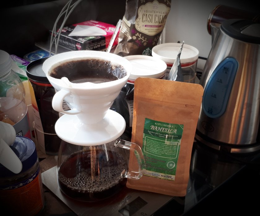 Air panas bergumul perlahan dengan bubuk halus kopi liberika. Menaro sambil berekstraksi dan akhirnya menghasilkan kopi tanpa ampas diatas gelas server……