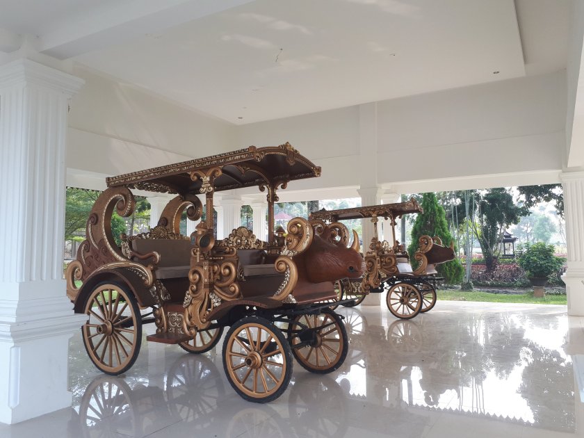 Tetapi sebelum memasuki pendopo, ada 2 kereta kencana yang terparkir eh berada di samping kanan depan pendopo dilindungi bangunan beratap joglo. Yang menarik adalah ukiran di depan kereta tersebut adalah replika kepala binatang yang dibuat dengan presisi dan kelembutan.