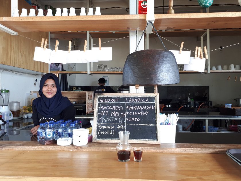 Bingung lihat kertas filter dan corong V60 serta cerewet manasin lagi air dispenser demi dapatkan suhu yang sempurna, apalagi lihat berbagai stok kopi yang dibawa dan disimpan di meja terbuka dari mulai arabica puntang, kiwari, gayo hingga merk kopi singa, tak lupa toraja dan robusta garut sukapura.