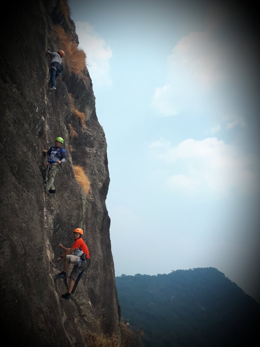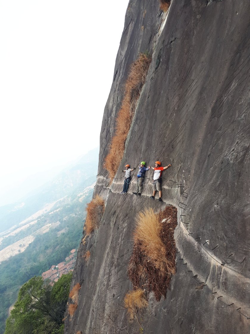 Carabiner harus selalu mengunci bergantian di sling adalah syarat mutlak pendakian ini. Pola pasang lepas pasang ini yang akan menjadi tantangan teknis. Klo urusan takut ketinggian sih… udah jelas dari awal, yang tidak berani ya sudah tunggu dibawah…. yang berani lanjut… yang berani diatas 75% lanjut, yang ragu-ragu… kembali, gitu aja kok repot.