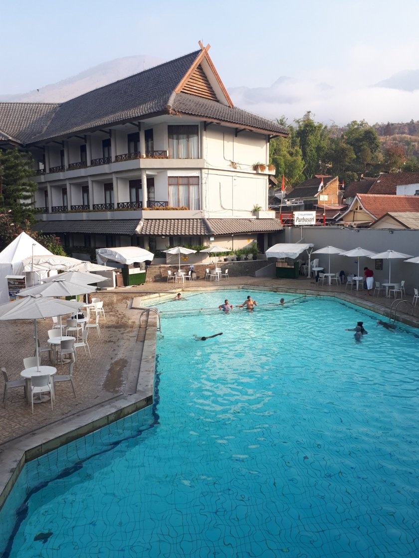 Kolam renang air panas ini selain fasilitas hotel juga bisa diakses dari luar dengan tarif 30ribuan… juga ada kamar rendam plus pancuran umum yang juga airnya panas alami… itu yang bikin ramai semenjak pagi.