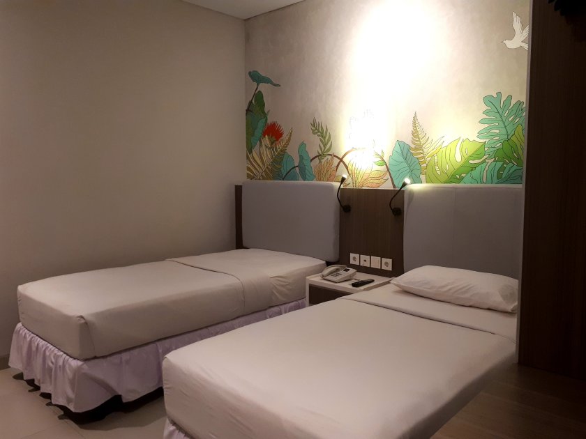 Bentuk kamar lowbudget, agak L4 tetapi secara fungsional cukup lengkap, twin bed, tv, water heater, dan kelengkapan lainnya. Lumayan buat istirahat.