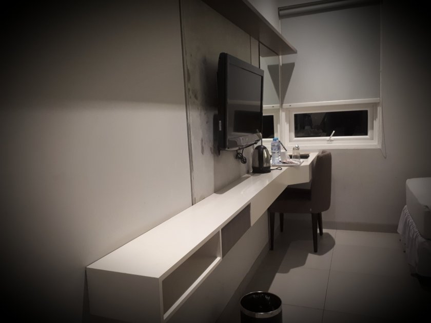 Ternyata jendela kecil disamping meja bisa langsung akses teriak ke warung di bawah sana, jadi selain room service juga bisa order via teriak minimal snack dan rokok… karena warungnya memang buka 24 jam.