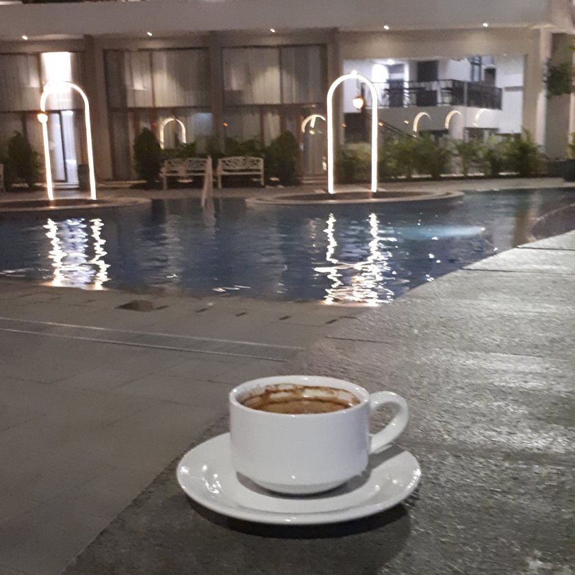 Aku sih gampang, keluar ruang rapat, menuju coffeeshop dan pesanlah sajian kopi hitam tanpa gula (kohitala)…. lalu cari spot skitar coffeeshop. Bisa nongkrong di bar atau di meja yang tersedia. Tapi pilihan kali ini berbeda, ngopinya dipinggir kolam renang yang diclaim airnya hangat… yaa hangat-hangat aiir kuku dech.