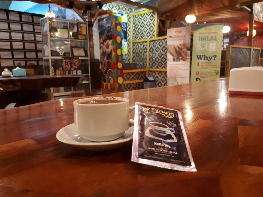 Setelah puas dengan tur singkat dan bersua dengan beberapa luwak (dikandangnya), giliran tujuan utama yang harus segera dihadirkan. Pesanlah 2 cangkir kopi luwak dengan metode tubruk sana tubruk sini… eh metode manual tubruk… tubruknya pelan-pelan yaa… takut terjatuh, apalagi hati ini sedang rapuh… ahaaay uuh.