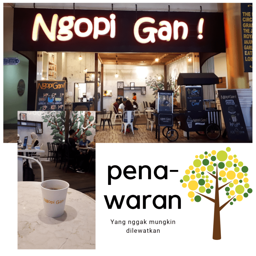 Nama tempatnya ‘Kopi Gan‘, sebuah ajakan untuk ngopay bagi juraganbaik juragan lanang ataupun juragan dewe (perempuan), tempatnya strategis dan nyaman dengan interior simpel fungsional. Nyarinya gampang, masuk di pintu masuk area Jatim park 3, luruss aja…. langsung keliatan. Klo mau masuk ke area pembelian tiket tinggal belok kiri dan turun ke lantai bawah menggunakan eskalator.