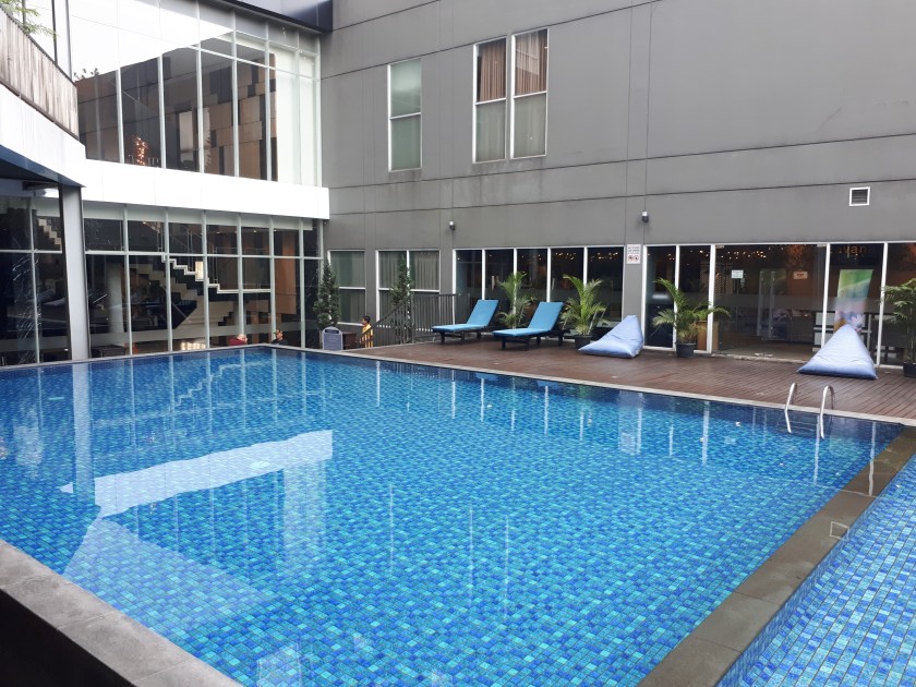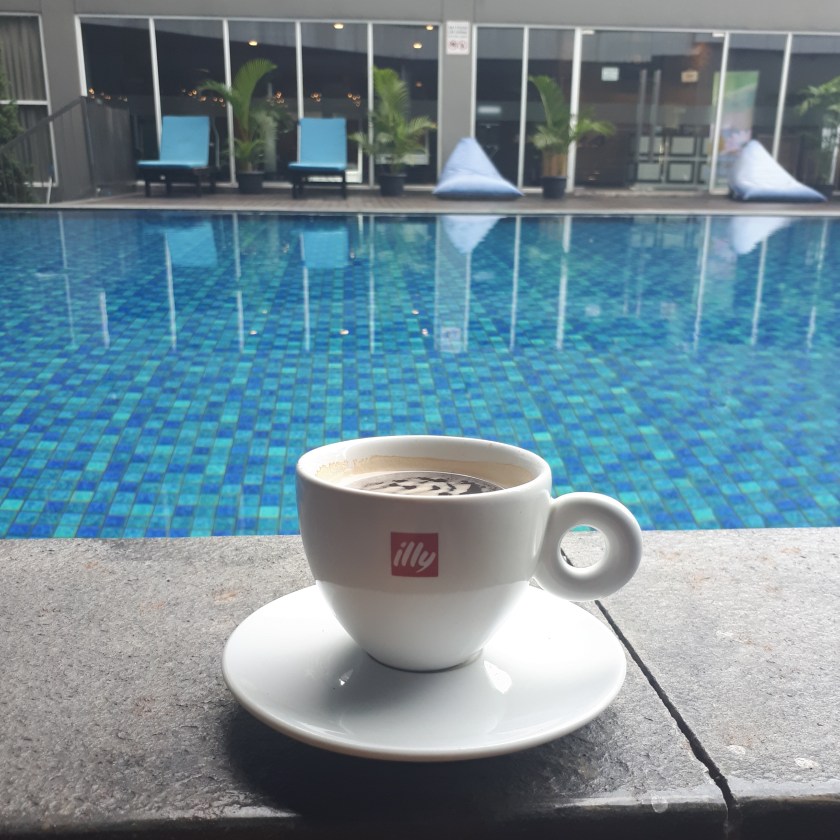 Kopi hitam yang tersaji adalah americano standar hotel, jadi secara rasa harus bersiap dengan sesuatu yang biasa, tetapi kelebihannya adalah suasana pinggir kolam renang yang membuat kedamaian sekaligus keceriaan.