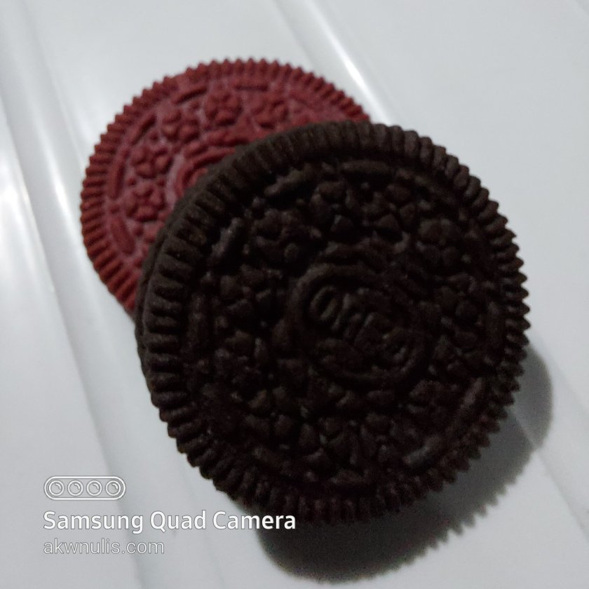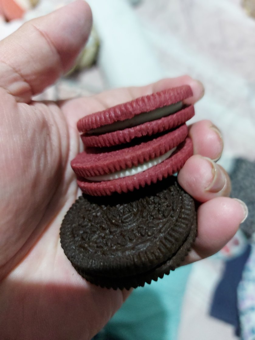Oh itu yang dimaksud, itu mah oreo biasa dan oreo red velvet dengan harga normal-normal saja dan membelinya di minimarket dekat rumah. Warnanya juga bukan merah, tapi marun.