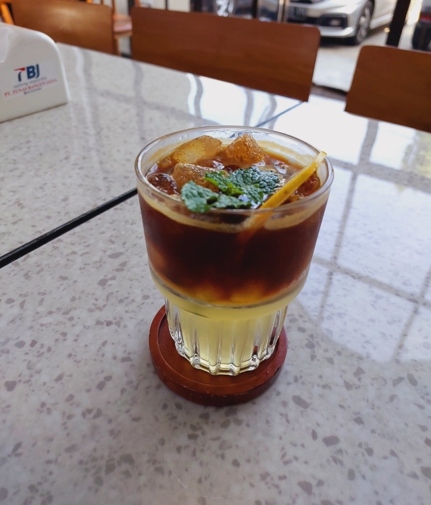 2. Sparkling lemon coffee Nah yang kedua adalah sebuah sajian kopi dengan lemon dan sirup gula plus soda jikalau menilik namanya. Tetapi hasil koordinasi dan lobi dengan sang barista maka opsi soda bisa dihilangkan. Ternyata tidak menghilangkan kenikmatan yang ada, apalagi 3 helai daun mint menyempurnakan sajian lemon kopi kali ini.