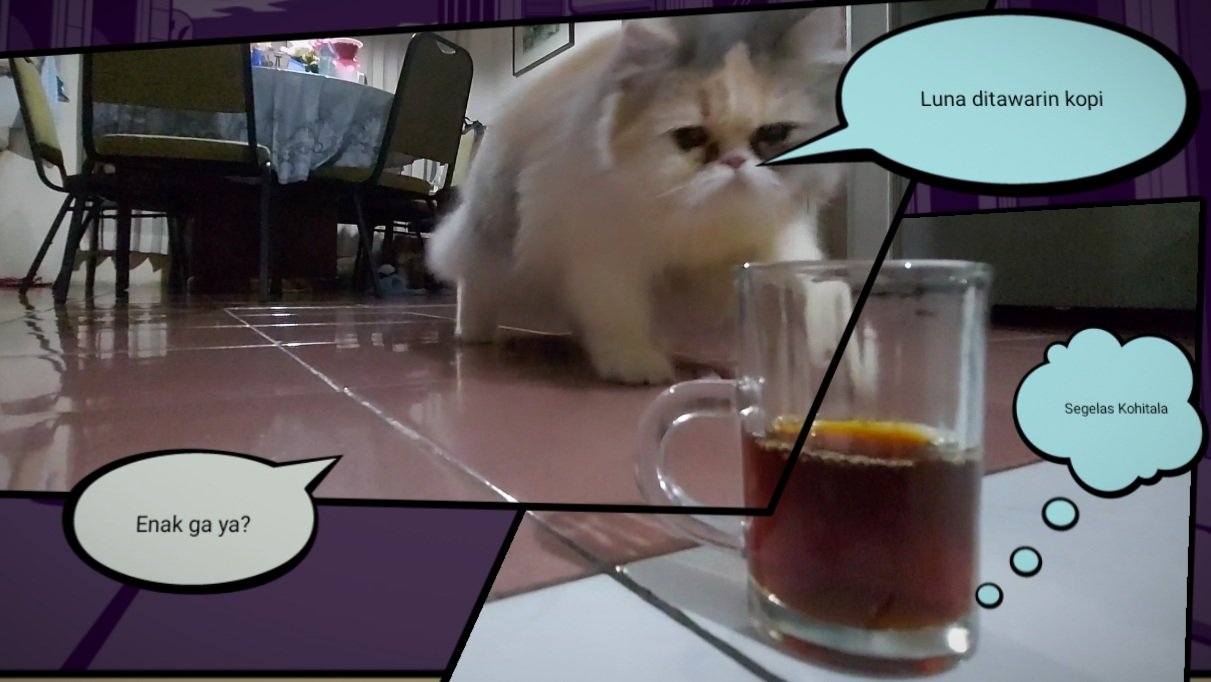 Raga beranjak dan menyimpan secangkir kopi di lantai, pake gelas kecil tentunya. Dilengkapi ketukan tangan dan suara mengeong dari mulut ini, perlahan tapi pasti mahluk berbulu putih kuning dan coklat mendatangi dan mengendus gelas kopi.