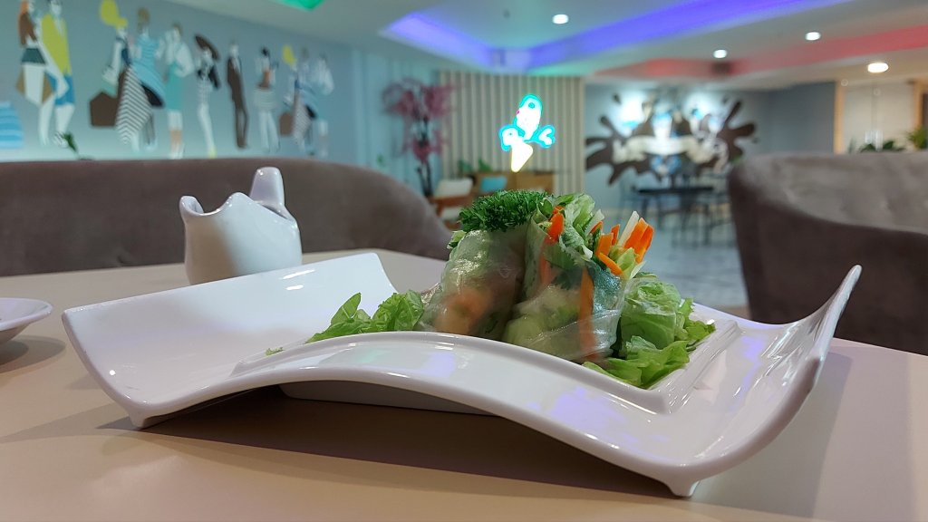 Mari belajar pasrah sambil mengunyah sayuran segar, potongan paprika, tomat cherry, jagung dan daun selada yang berbungkus kulit lumpia besar, diolesi bumbu segar penuh sensasi. Memberikan kesempatan geraham dan lidah berolahraga dan olahrasa agar menenangkan hati yang gundah gulana.
