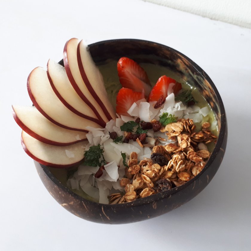 Smoothie hijau dan segar yang terbuat dari daun kale, buah pisang, mangga, yoghurt, daun mint, nanas, dan lemon, ditambah dengan apel, strawberri, serpihan kelapa, mint segar, dan goji berry.