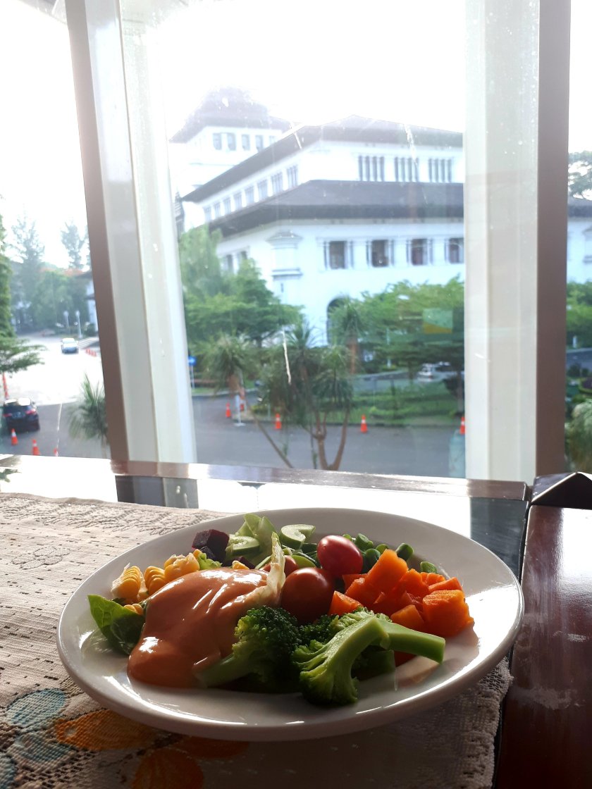 Alhamdulillah, sarapan dengan salad sayuran 7 rupa dengan latar belakang gedung sate yang megah, am.. am…. nyam nyam.