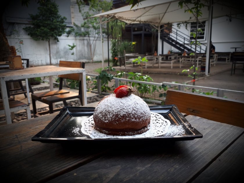 Kedua, Roti Aceng Munu’u. Roti ini dipilih karena home made dan mengandung kopi serta bentuknya kembung (munu’u, bahasa sunda). Disajikan dengan taburan tepung gula putih dan sebuah strawberry nangkring di puncak munu’unya, rasa lumayan didukung suasana alami area cafe cenghar ini. Namanya roti Aceng alias Ala-Cenghar, ada-ada aja, kirain yang bikinnya pak Aceng, temen kantor yang kebetulan rumahnya sekitar cimahi.