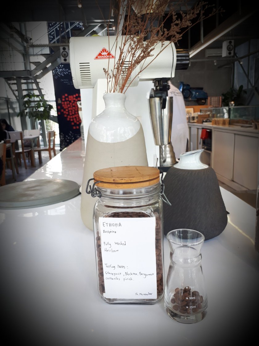 Sekarang ke kopi ethiopia yaa…. klo liat tulisan di botol kopinya, ada taste notenya stonefruit, blacktea, bergamot, cocoanibs.