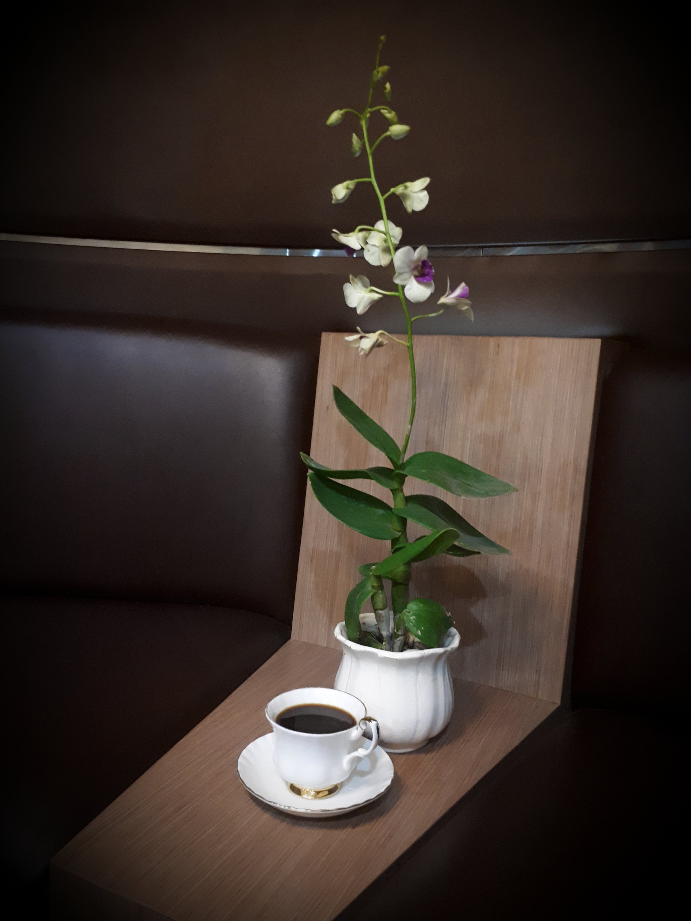 Air panasnya juga nggak pake ukuran suhu, cukup ambil dari termos. Langsung seduh pelan-pelan. Ya diaduk dikit supaya larut dan diamkan sejenak, ternyata cremanya naik ke permukaan dan membantuk lapisan berbeda berwarna coklat. Hmmm keharuman kopi menggugah selera. Untuk melengkapi rasa dan suasana, jangan di dapur ah. Geser ke halaman samping dan bersiap untuk diabadikan diantara bunga anggrek kesayangan ibunda.