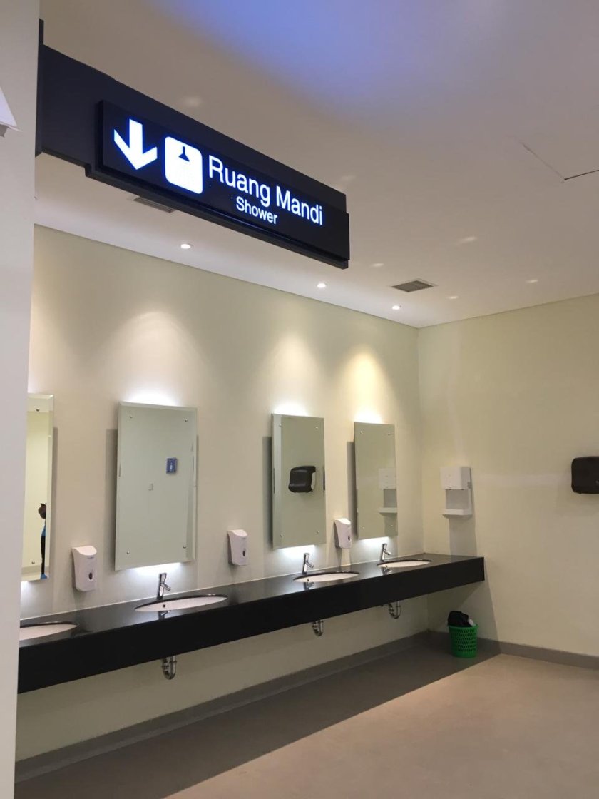 Ada 16 kamar mandi dengan fasilitas air hangat, 8 buah untuk pria dan 8 buah ruang mandi wanita, cukup buat menyegarkan tubuh dan pikiran sebelum melakukan penerbangan jarak jauh baik luar jawa juga (nantinya) penerbangan luar negeri.