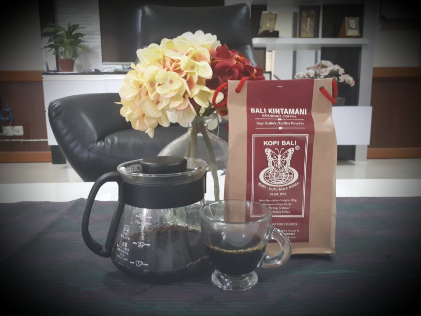 Inilah yang menyambutku di sini, sajian kopi arabica bali kintamani yang disajikan Barista Wayan Adi di cafe yang bernama Panon Hideung.