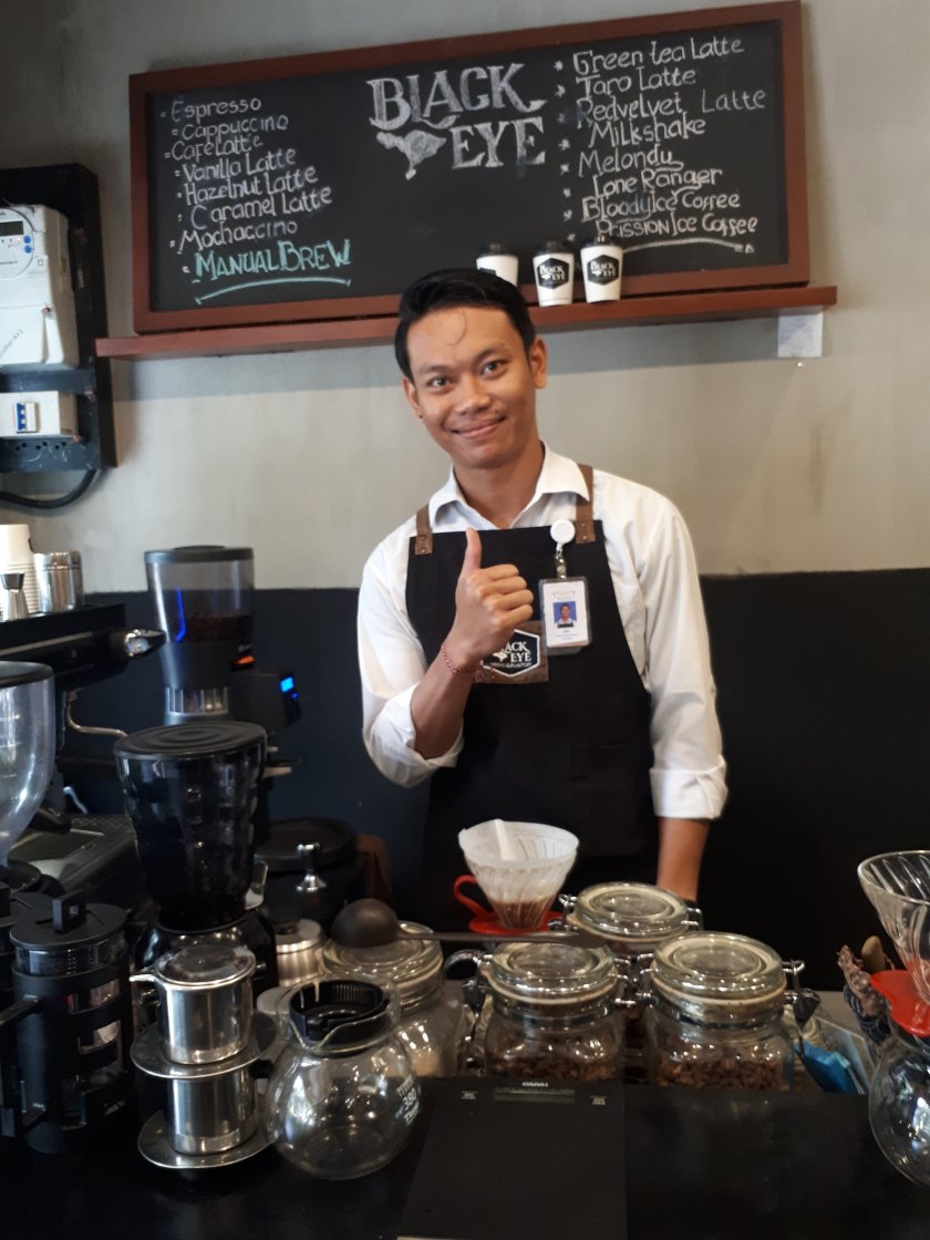 Ihh… bener, tapi pake bahasa inggris, jadi namanya Cafe Black Eye, kepoin aja IGnya blackeye.ID, “Bener khan artinya panon hideung?”