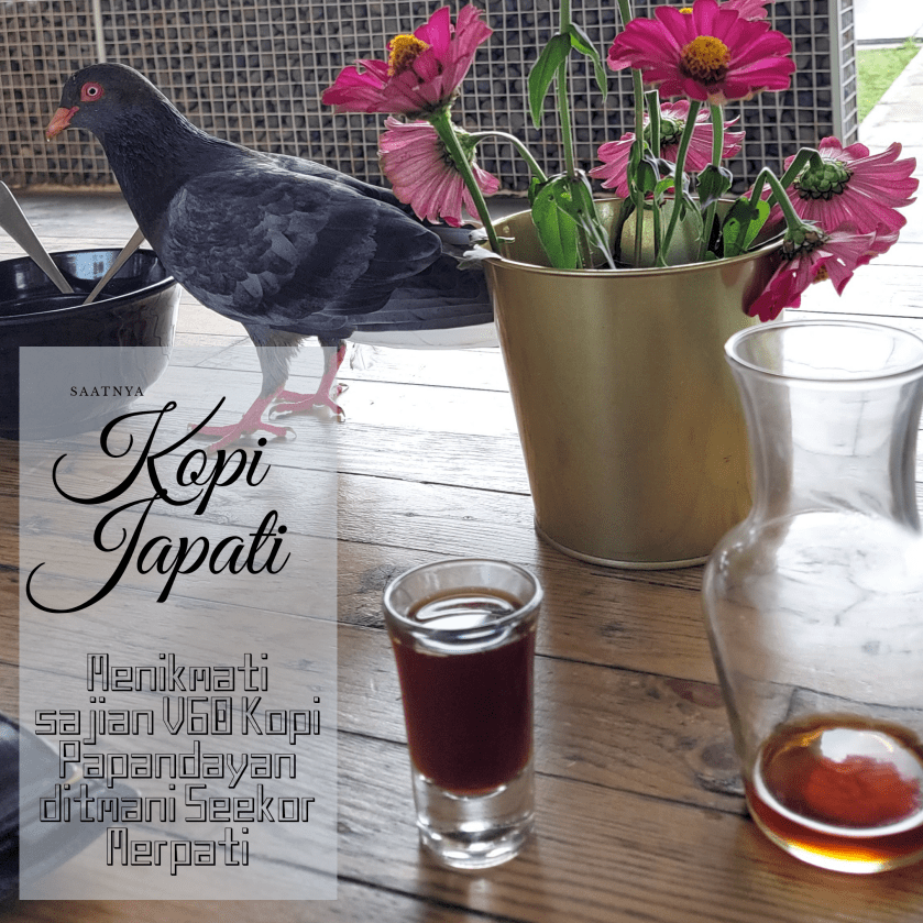 Kejutan lainnya adalah teman ngopinyapun spesial, yaitu merpati atau japati. Entah lapar atau memang merpati nggak pernah ingkar janji, maka dikala raga ini sedang sendiri, datanglah seekor merpati menemani. Clingak clinguk dan memberi sedikit kerling serta senyumannya kepadaku, kubalas dengan menyorongkan kamera agar dapat mengabadikan momen berharga ini, NGOPI JAPATI. Minum kopi sambil ditemani seekor merpati yang tiba-tiba hadir tanpa basa basi.