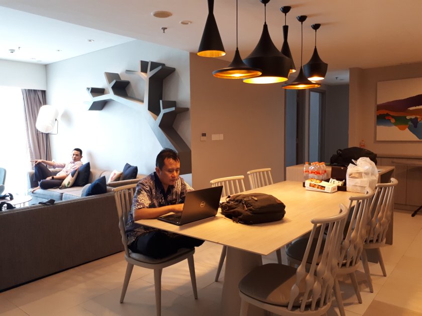 Masuk ke lokasi apartemen… wuih adem, naik ke lantai 4 apa 14 ya?… lupaa euy, ikutan masuk kamarnya… buseeet luas bangeet, kamarnya ada 3 buah dengan 1 kamar besar lengkap dengan toiletnya. Ada juga toilet diluar, trus ruang tamunya nyaman, televisi terkini yang besar deng sofa empuk, ada ruang makan yang bisa juga dipake buat meeting terbatas. Pantry, kulkas, dispenser…. ah jadi pengen bawa keluarga.