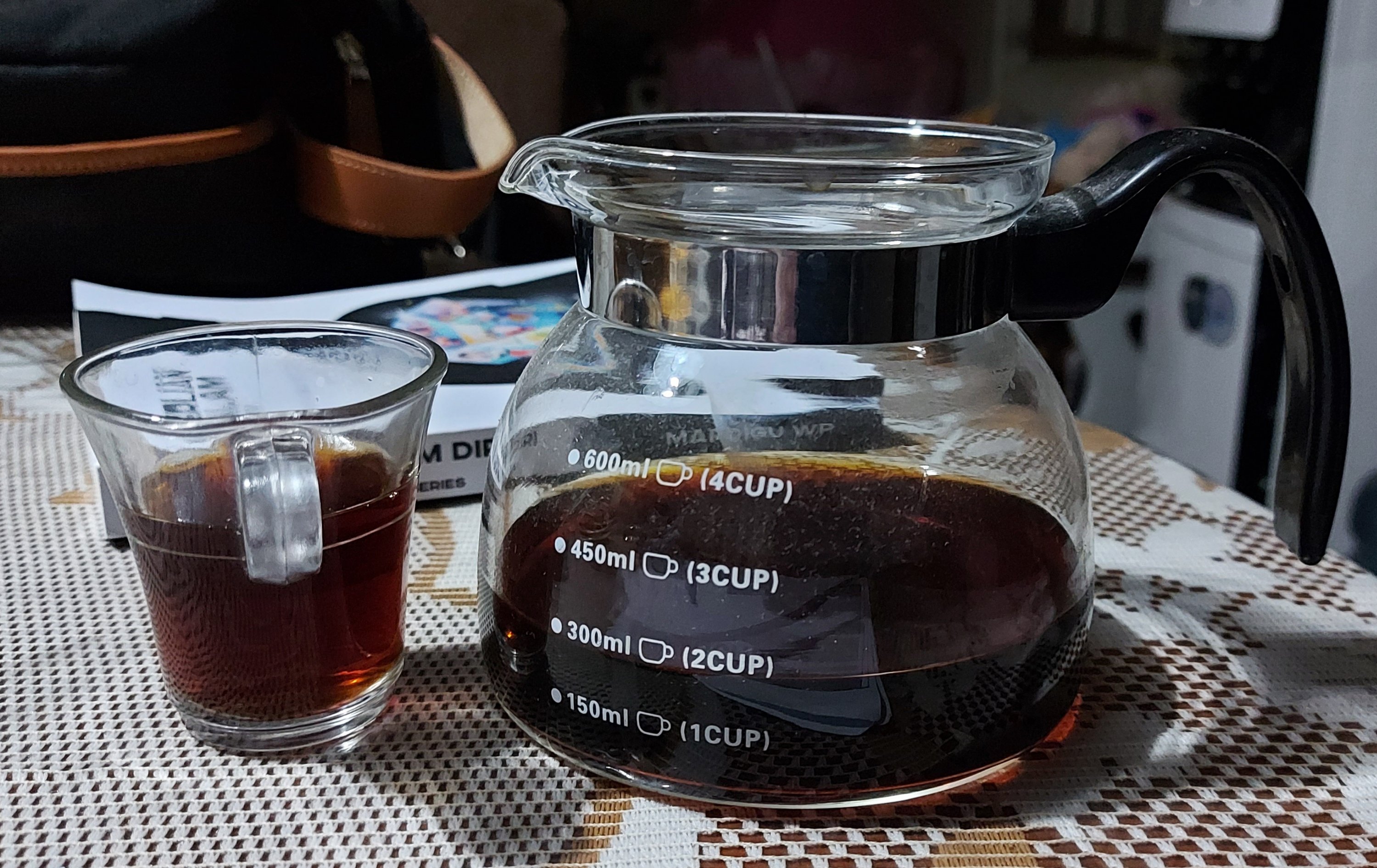 Mau dibalik lagi gelasnya dibawah, nggak lucu ah. Maka dengan konsentrasi penuh gelas dan pisin atau tatakan ini diangkat perlahan dan buka celah gelas dengan hati – hati. Karena jika bukanya terlalu lebar, air kopinya keluar semua dan dijamin akan tumpah karena pisinnya kecil.