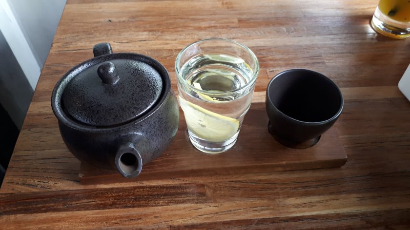 Tapi… agak mengernyitkan dahi karena disajikan dalam poci abu-abu tua lengkap dengan cawan mini berwarna senada, pake tatakan kayu yang warnanya matching plus segelas air putih ukuran sedang yang udah berisi irisan melon eh lemon, buat penetral rasa dan perasaan yaaa….