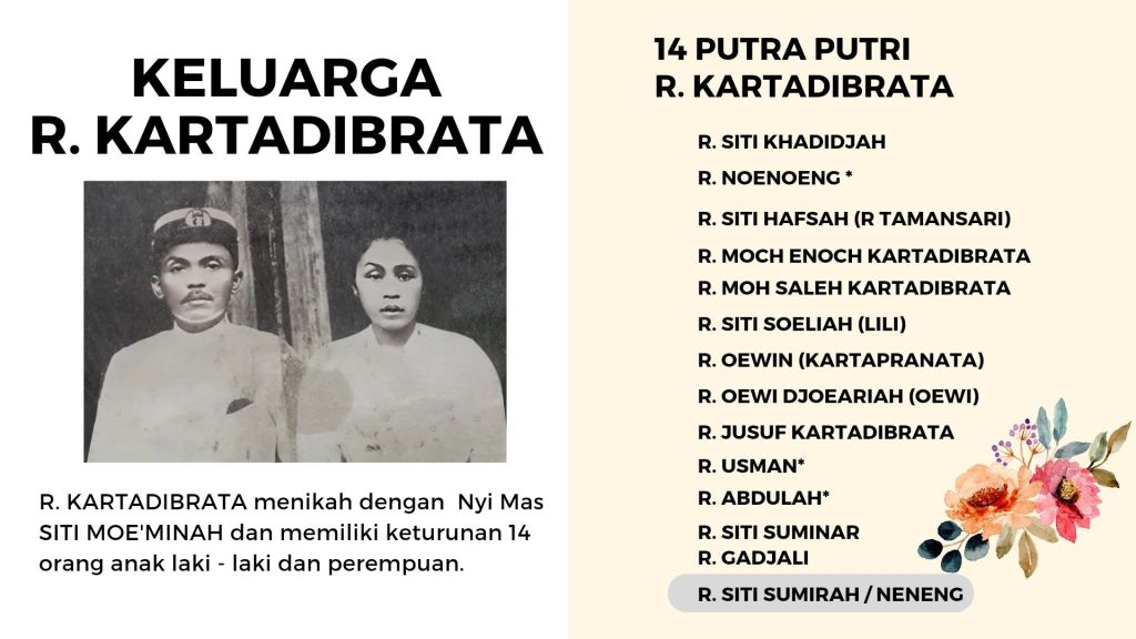 Dari pasangan R. Kartadibrata dan Nyi Mas Siti Moe’minah ini memiliki 14 putra dan putri yang menjadi generasi kedua atau G2 yaitu :