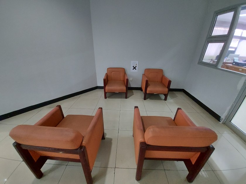 Tindakannya sebenernya sederhana, memisahkan kursi baik kursi tamu di ruang kerja ataupun kursi tamu diluar ruang kerja serta menempelkan peringatan ‘please jaga jarak’ yang merupakan prinsip SOCIAL DISTANCE di kursi agar tidak diduduki.