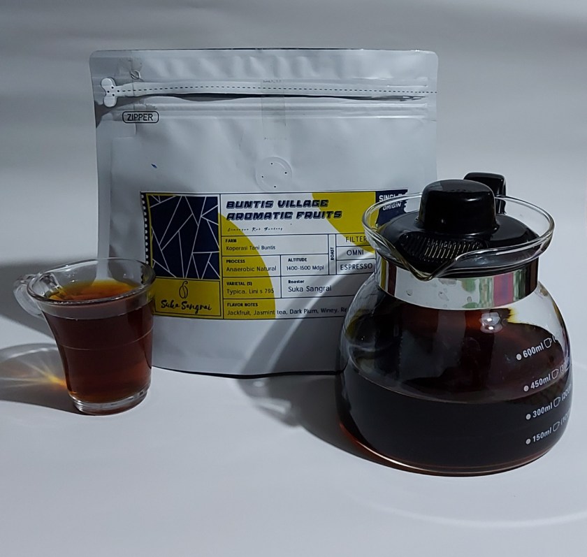 Setelah prosesi tuntas dengan 400ml air bersuhu 90° celcius, maka hadirlah kopi hitam tanpa gula (kohitala), srupuut….. hmmmmm… woaaaah rasanya begitu kaya, eh kok ada rasa tembakau?…. atau winey ya?… enak euy.