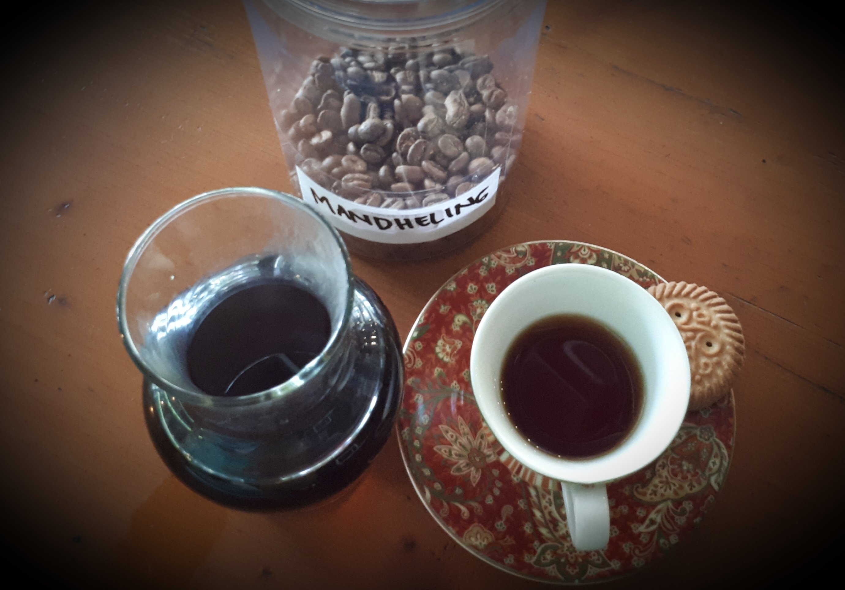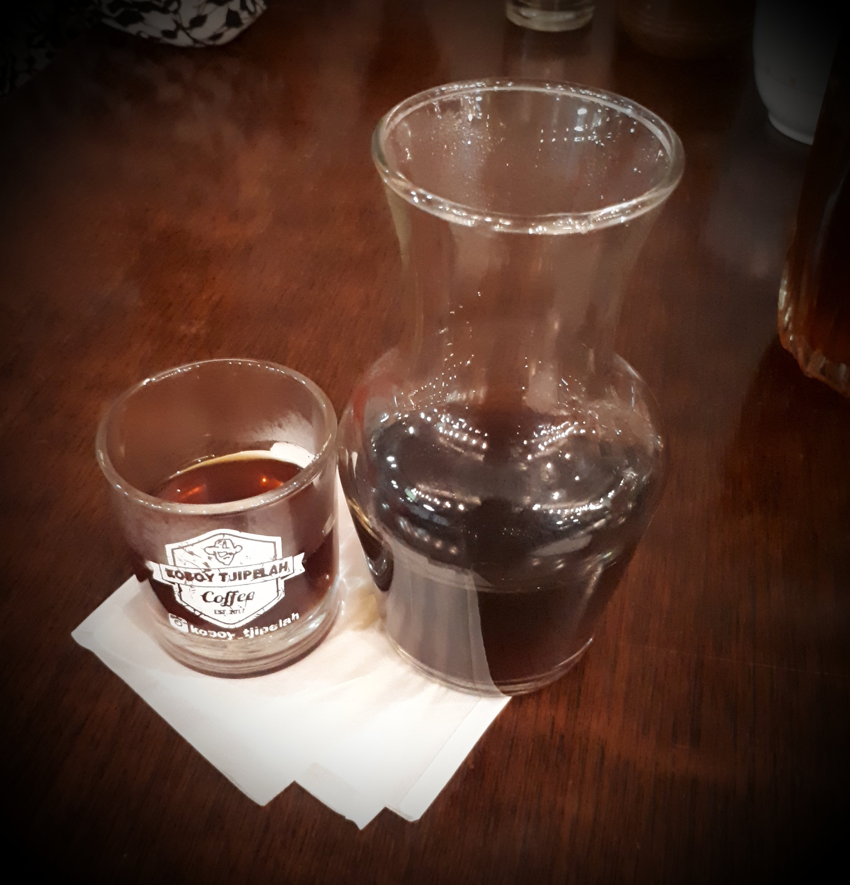 Ternyata dengan metode seduh manual v60 dapat menghasilkan rasa pahit yang lembut dan bulat serta selarik manis malu-malu hadir namun segera menghilang karena terhenyak dengan kenyataan. Untuk melengkapinya maka pesan lagi kopi tubruk biasa yang disajikan dalam bentuk gelas yang unik khas cafe ini, namanya Cafe Nata De Koffie di daerah sekitar terminal Dago Bandung.