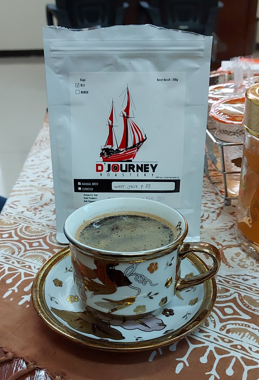 Kopi yang disajikan adalah kopi jabar dengan kode west java P.88 hasil roaster D’Journey. Pastinya dengan diseduh tubrukpun tetap muncul acidity medium dan body mediumnya dengan after taste selarik citroen hadir meskipun akhirnya hilang kembali.