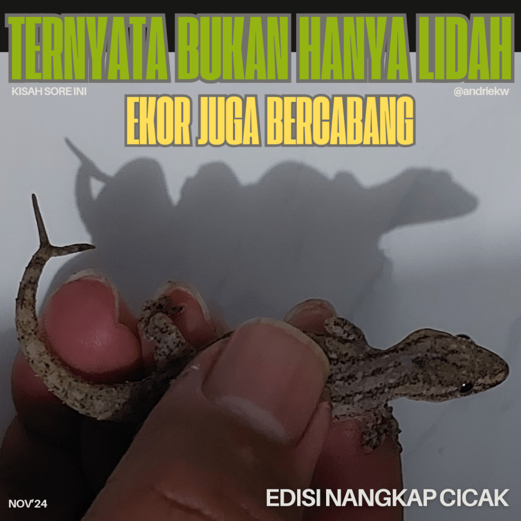 Setelah tuntas didokumentasikan akhirnya sang cicak disimpan di halaman luar dan biarkan kembali menyatu dengan alam. Namun ada satu hal yang menambah pengetahuan bahwa bukan hanya lidah yang bercabang seperti lidah hewan melata tapi juga ada binatang yang berekor cabang dua. Selamat memaknai pencabangan ini, yang penting jika dikaitkan dengan urusan pikiran maka dibolehkan bercabang tapi tetap untuk sebuah penyelesaian harus fokus sesuai prioritas dan tujuan yang akan dicapai.