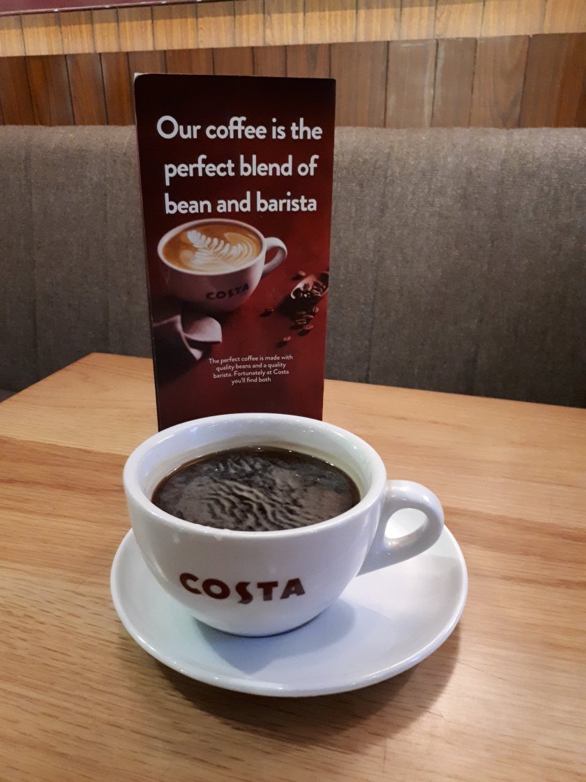 Maka… mlipirlah mencari tempat ngopi yang agak sepi sehingga bisa sesaat menghilang dari kenyataan dan berkutat dalam dunia kesendirian… lokasinya dicari di lantai 2 dan diujung terdapat pilihan tempat yang pas yaitu Costa Coffee. Setelah berada di depan sang barista maka pesanlah kohitala dalam bentuk americano, lalu duduk di kursi ujung yang cukup temaram serta relatif sepi.