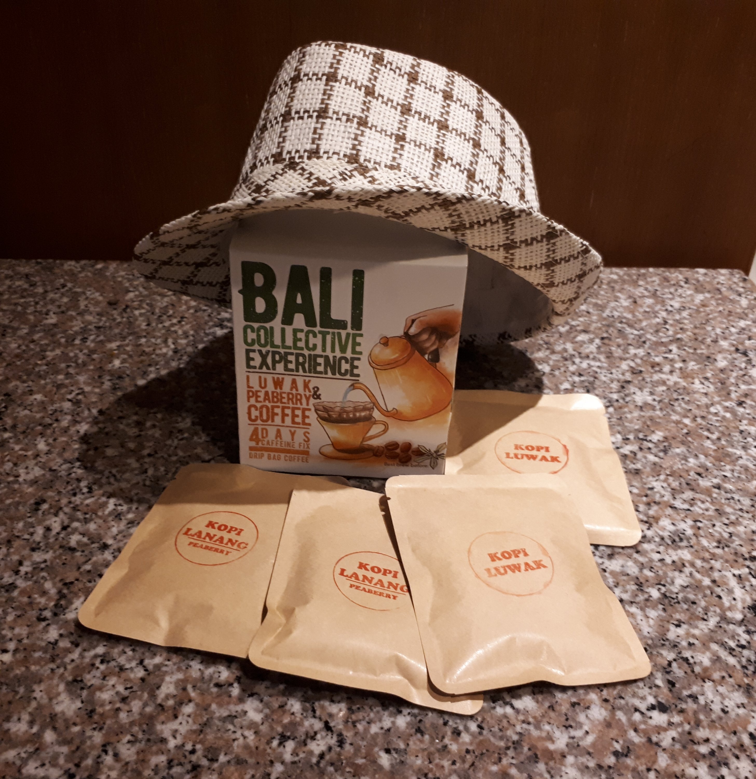 Sekotak kopi ini harganya Rp 52ribu, isinya 4 buah bungkusan, 2 buah kopi luwak dan 2 buah kopi lanang peaberry yang dibuat oleh Bali Iswara….. ditambah sebuah topi pelindung panas juga buat sedikit bergaya dikala beredar di pulau dewata.
