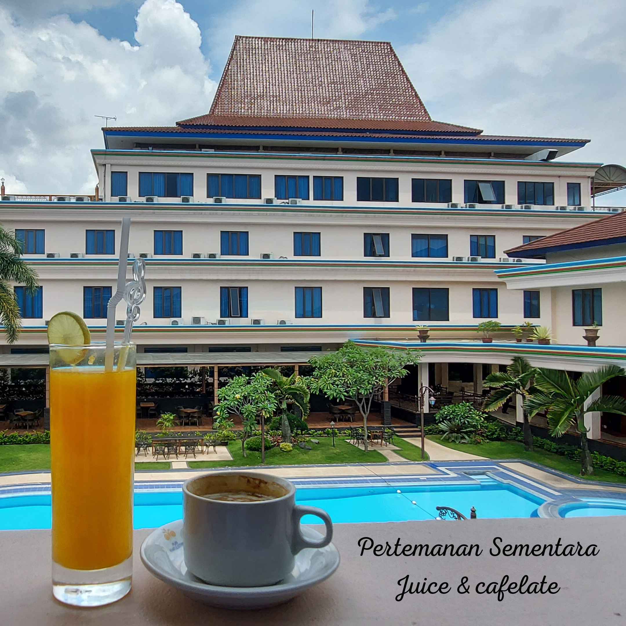 Dengan berat hati dan mengendalikan gejolak keinginrenanganku ini, maka hanya bisa memotret suasana kolam renang dan siluet tetesan air hujan di beningnya kaca. Raga mundur perlahan dan berbelok arah menuju coffeeshop saja. Mencari seruput kopi yang mungkin bisa menenangkan gejolak ini dan kembali berdamai dengan keadaan dan menyusun ulang rencana tindak ke depan.