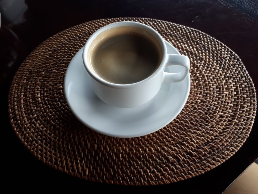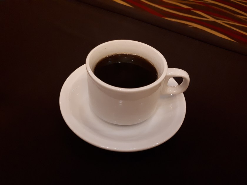 Melangkah sambil agak goyang-goyang jaga keseimbangan hingga akhirnya 2 gerbong terlewati. Ahaa…. kompartemen makan pas kosong, bisa duduk dengan nyaman dan order ‘Obat penghilang keruwetan’ yaitu…. segelas kopi pahit, titik.