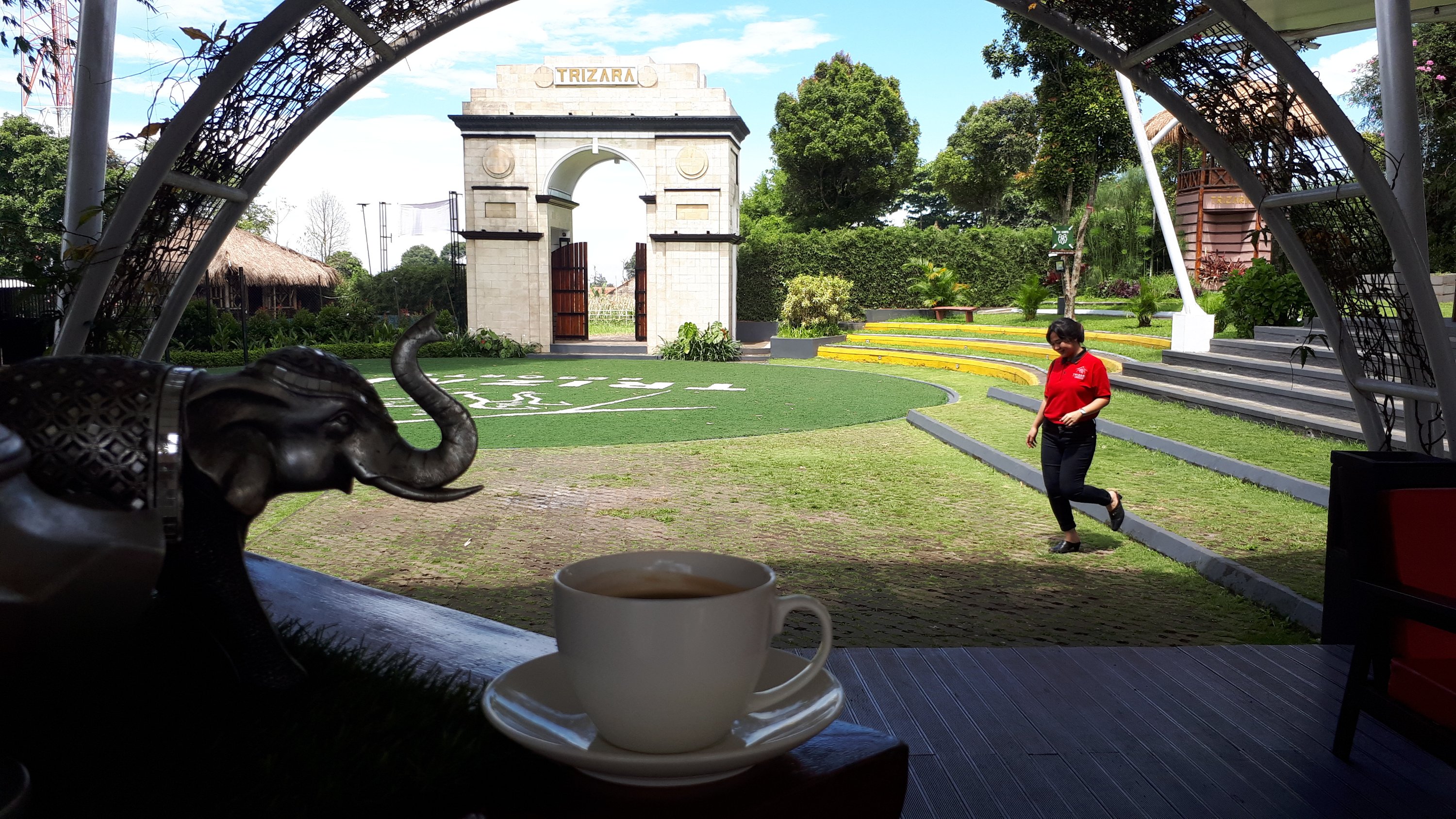 Tapi tulisan kali ini adalah momen ngopi disini tapi kopinya berbeda. Kopi hasil racikan sendiri di rumah dengan metode manual brew V60 dan biji kopinya adalah arabica wanasuka dari seribukopi roastery bapak ampi Cimahi. Dibawa di botol dan tak lupa membawa gelas kaca mini phirex kesayangan. Setiba di lokasi langsung mengarah ke atas kiri, tepatnya ke Pasar Kebun. Sebuah nama untuk kawasan belanja alami dan nongkrong di weekend kalau nggak salah. Setelah berkeliling sedikit lalu mendaki dengan tangga besi hingga mencapai halaman belakang hotel yang sekarang sudah punya ornamen baru yaitu gapura ukir dengan gaya bali.