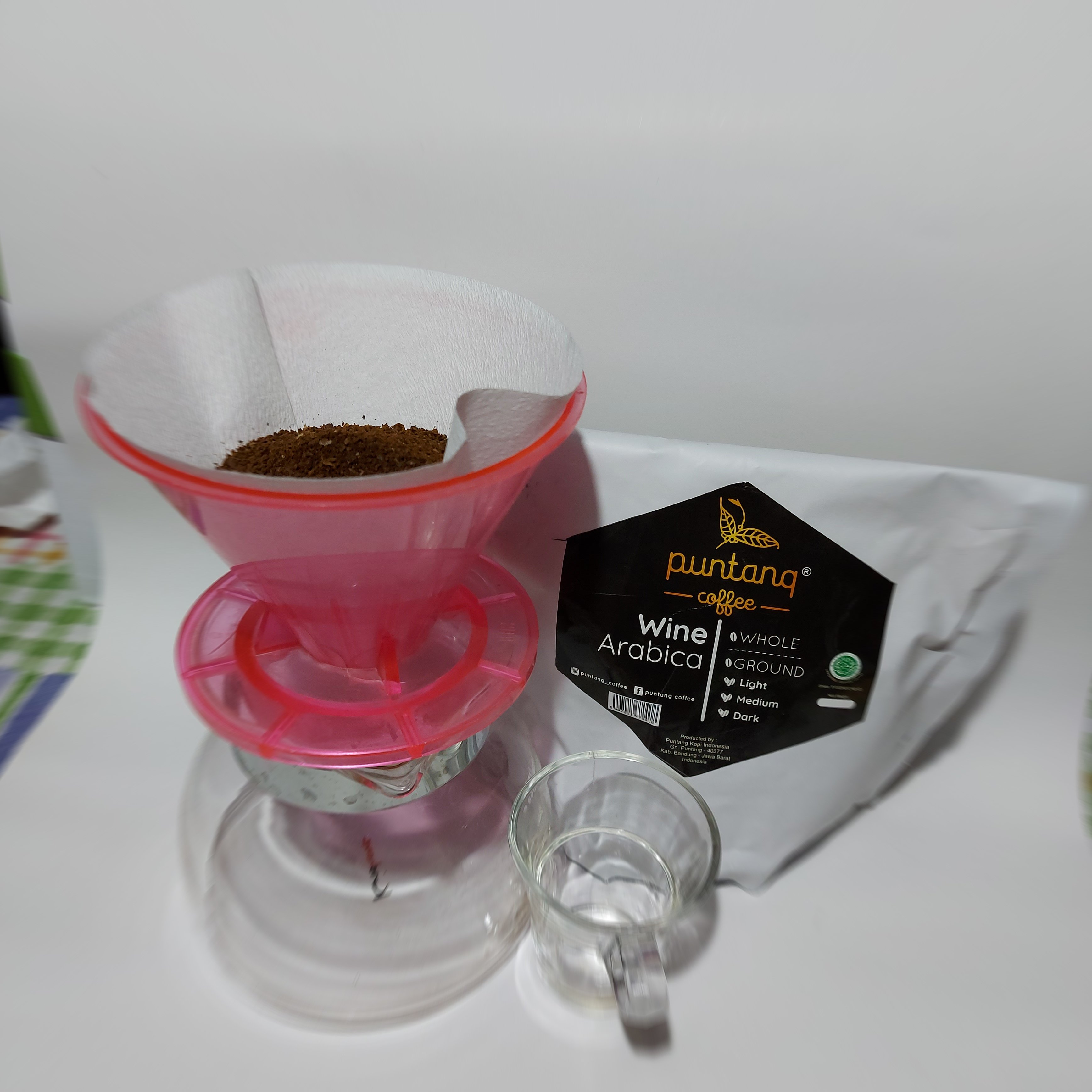 Alhamdulillah, setelah memprosesnya dengan penuh sukacita, karena ini adalah manual brew V60 perdana setelah ramadhan tahun ini, maka .. dengan bean spesial kiriman seorang kolega pencinta kopi juga Mr AGS maka semakin menyenangkan prosesi ini. Beannya adalah Wine Arabica Puntang Coffee yang diproduksi oleh Puntang Coffee Indonesia – Gunung Puntang Kab. Bandung 40377 belum apa-apa sudah harum abisss….. apalagi pas di grinder dengan putaran 3, wuihh harum semerbak memenuhi ruangan dan menjadi parfum alami yang menyenangkan hati.
